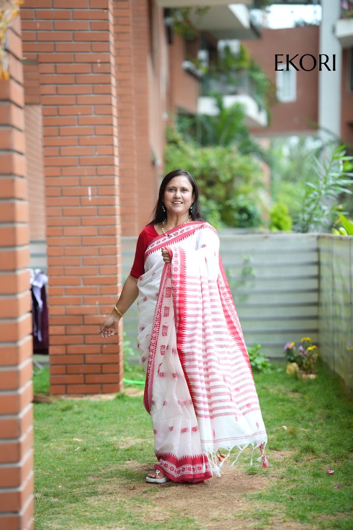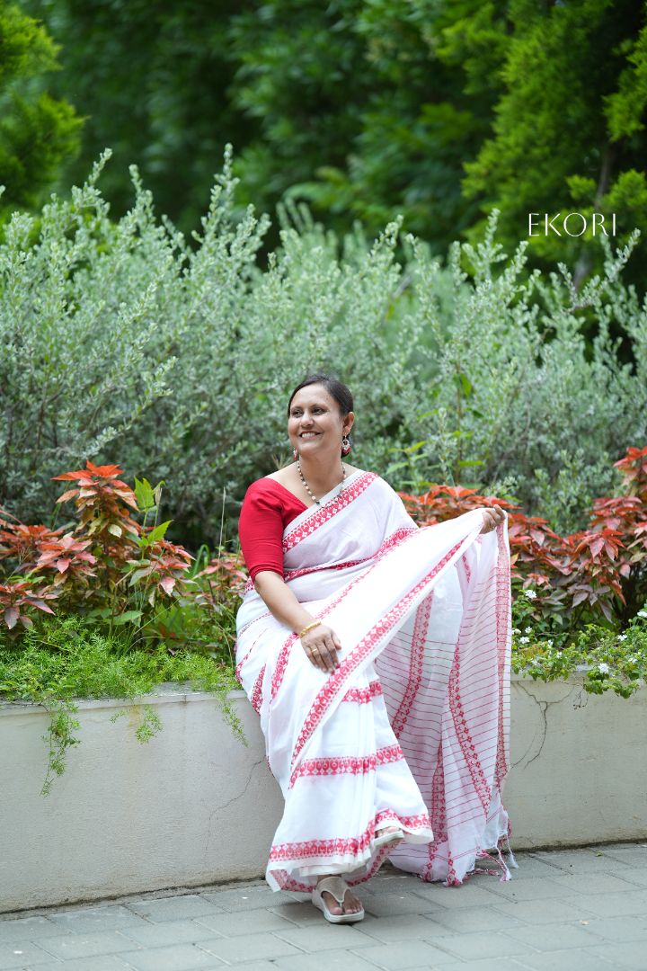 Red and White Kahdi Cotton Saree