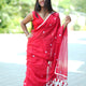 Red coloured cotton Jamdhani saree, detailed with fine pinstripes and dainty white butis finished with handcrafted tassels and lace