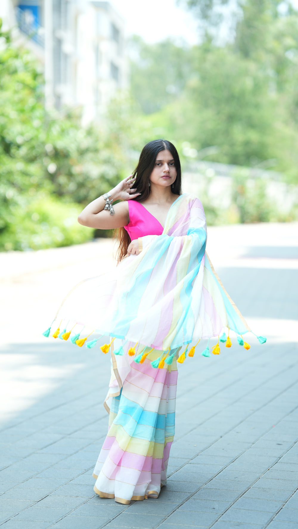 Sunlight, mango juice, and breezeβ€”the saree captured it all. Bright colors giggled down her shoulder, unapologetically joyful. Grass between toes, music in the air, and nothing urgent to do. It wasn’t about youthβ€”it was about being alive. She didn’t chase time. She laughed with it, wearing stripes that knew how to dance, not just lie still.