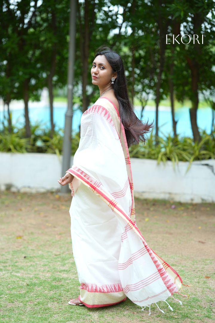 In a Mishti Lal Bengai Khadi cotton saree, a woman wandered through the vibrant streets of Bengal. The saree's rich red hue, reminiscent of traditional Bengali sweets, stood out brilliantly against the backdrop of bustling markets and festive colors. Its hand-spun cotton fabric, soft and elegant, echoed the region's craftsmanship. As she moved gracefully, the saree blended seamlessly with the lively spirit of Bengal, celebrating its cultural richness and warmth.