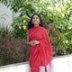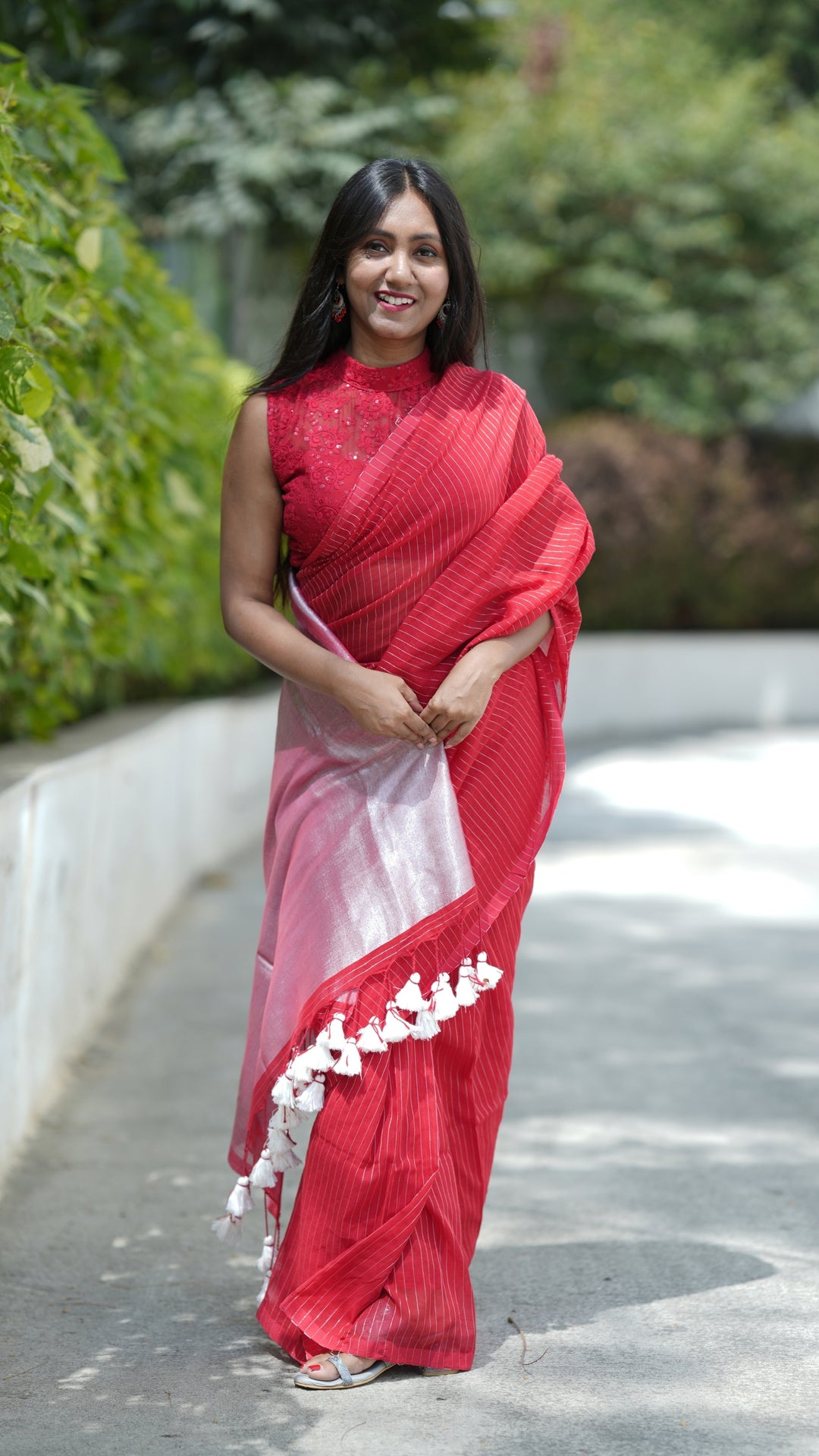 Wearing the Laal Sitara saree, she stood there like a vision of fiery elegance. The deep red fabric sparkled with intricate golden stars, each one shimmering like distant constellations in the night sky. As the saree's rich hue cascaded around her, it felt as if she carried the essence of both passion and grace, captivating everyone who saw her.
