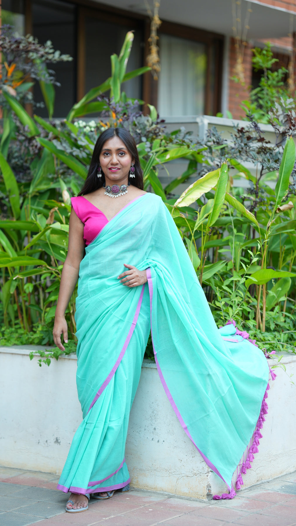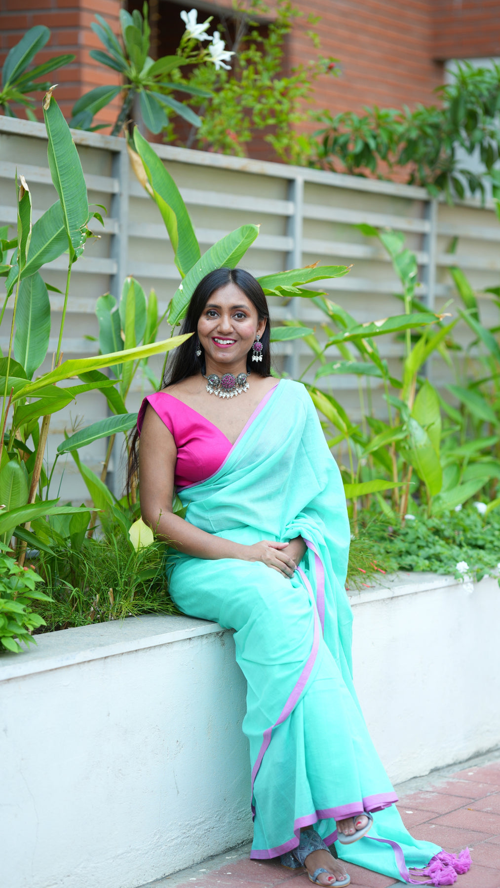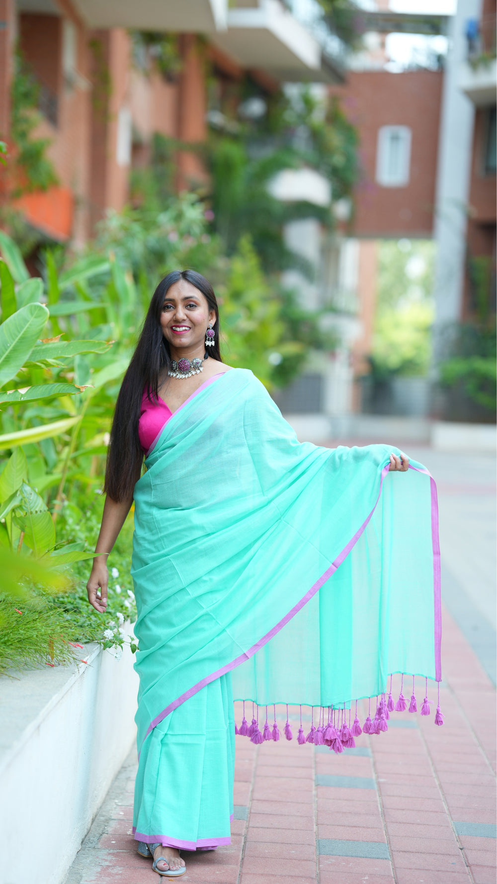 Bathed in sea breeze and soft morning light, she walkedβwrapped in sea green mulmul, tassels trailing like coral whispers. Dreams shimmered around her like ocean mist, vast and fearless. Each step echoed waves chasing the horizon. She wasnβt just wearing a saree; she was becoming the tideβgentle, unrelenting, infinite. In her, the ocean found its sky