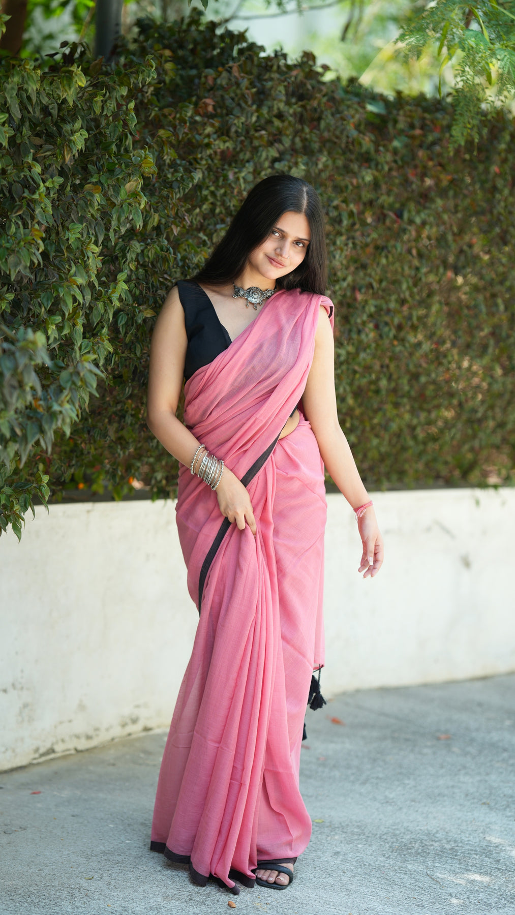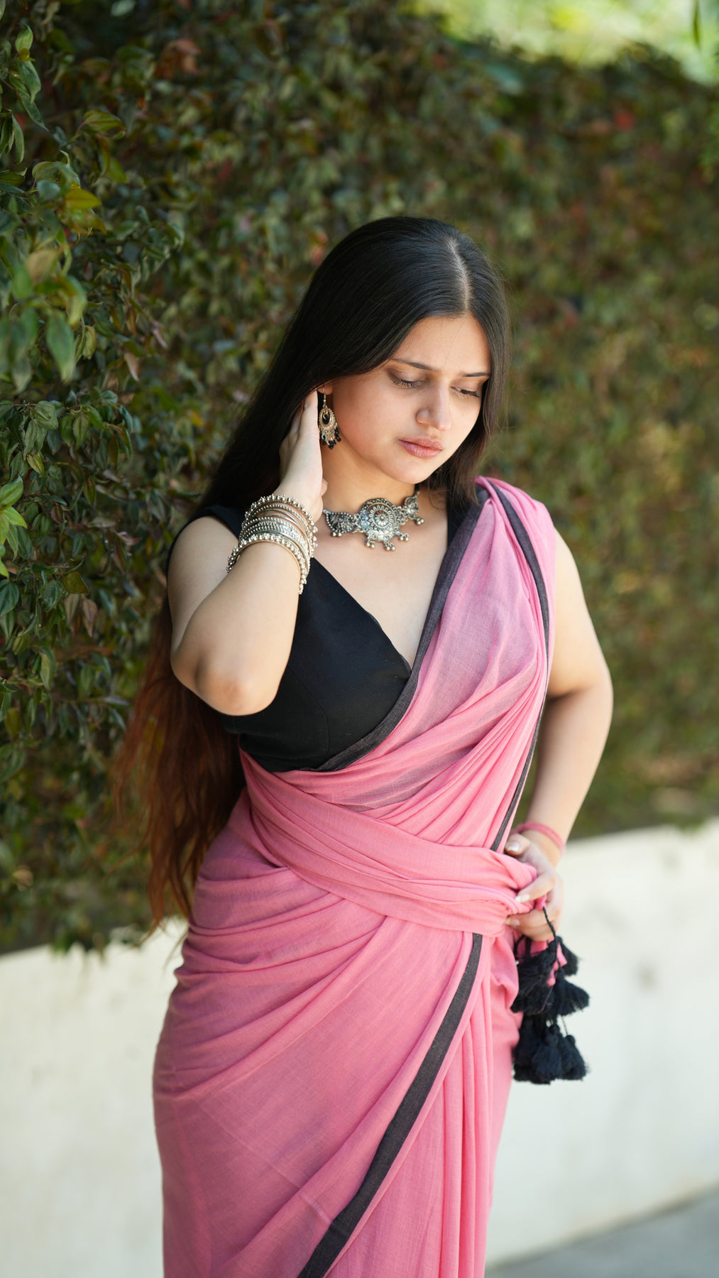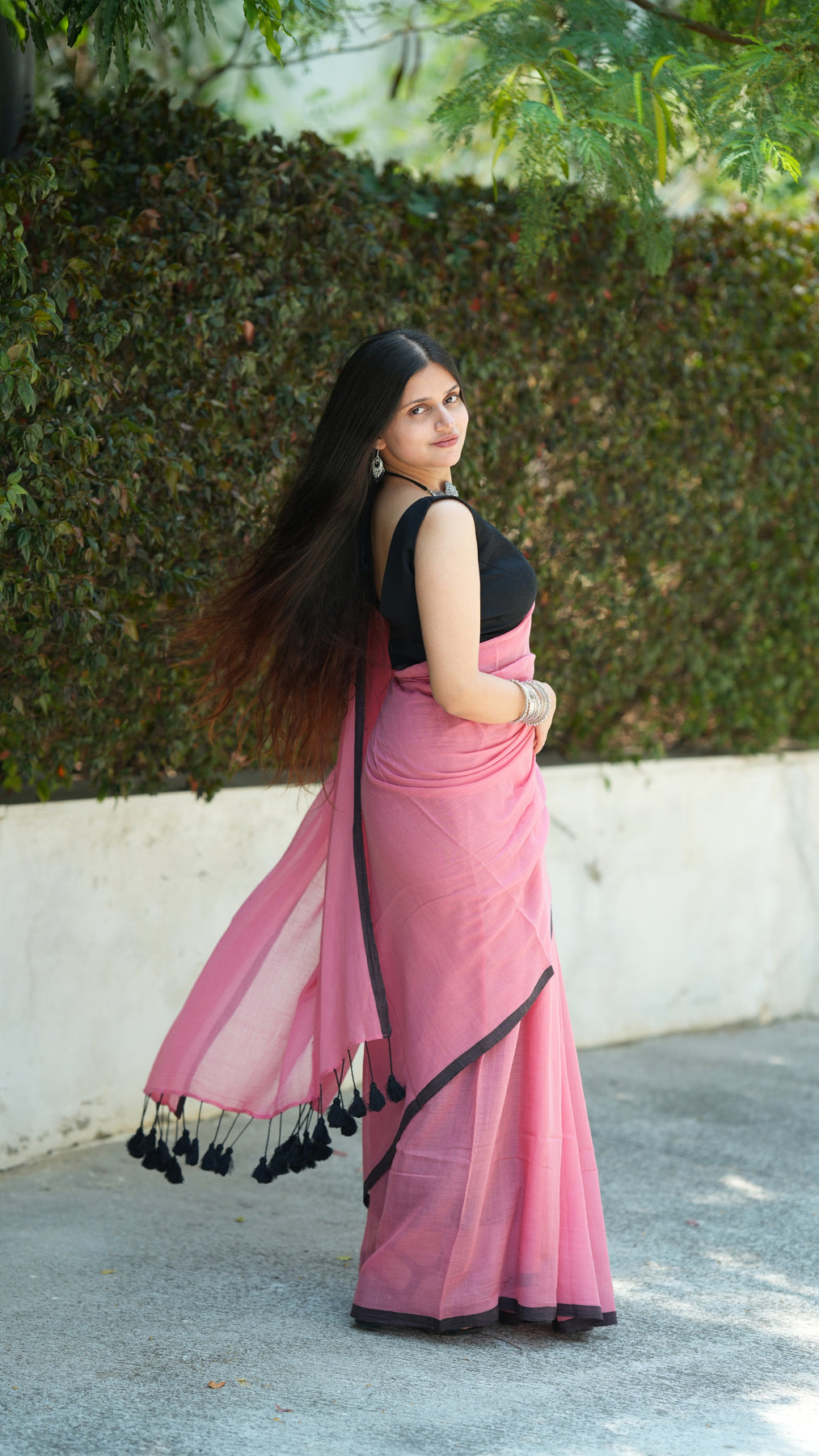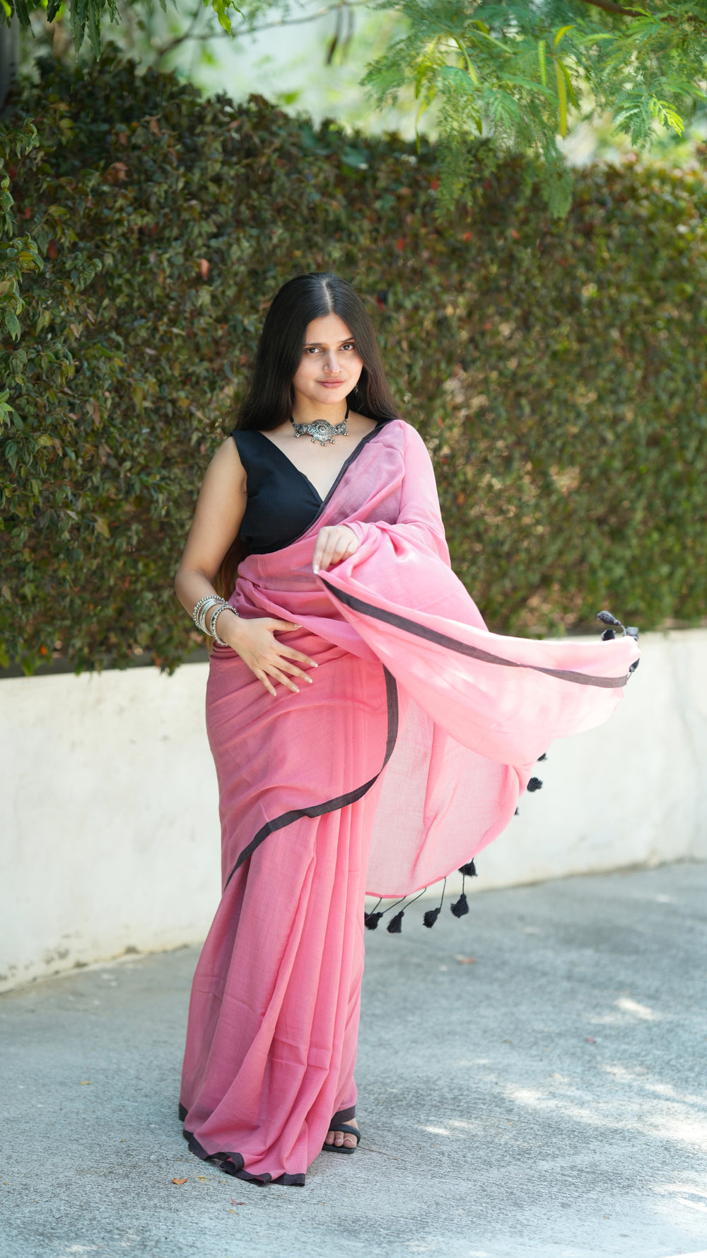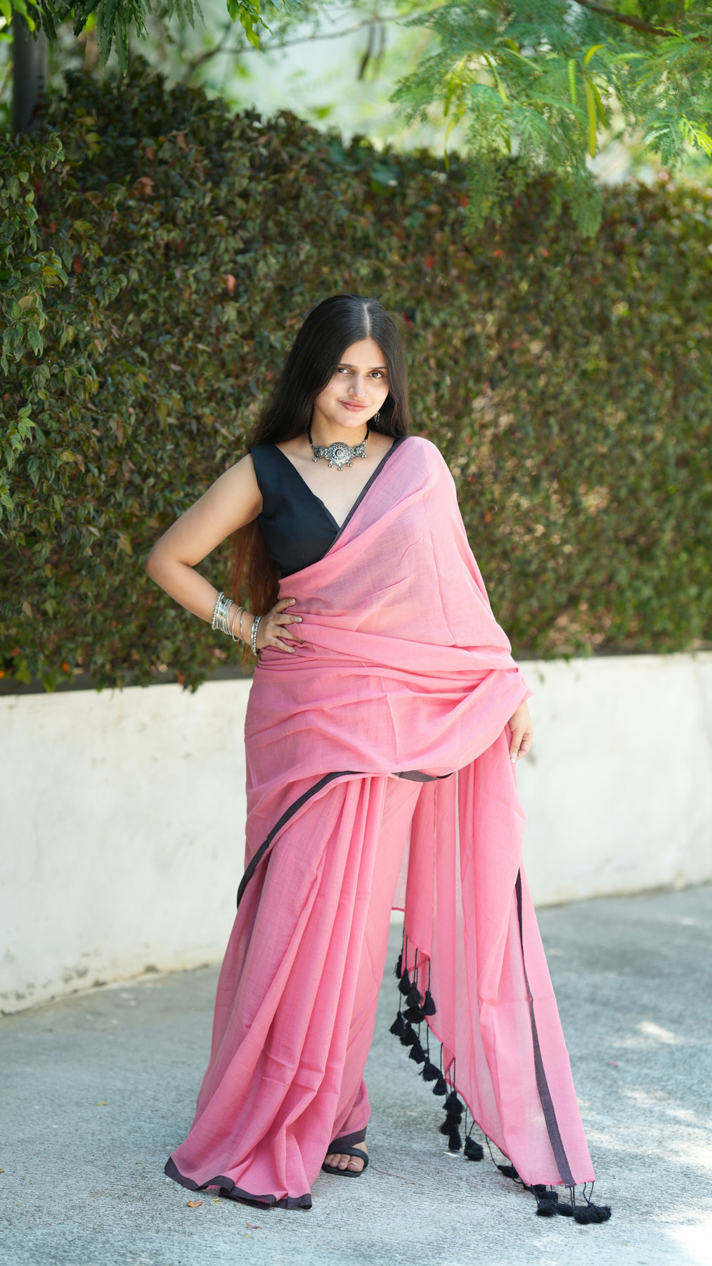 Dusty Pink Soft Mulmul Saree with Black Tassels