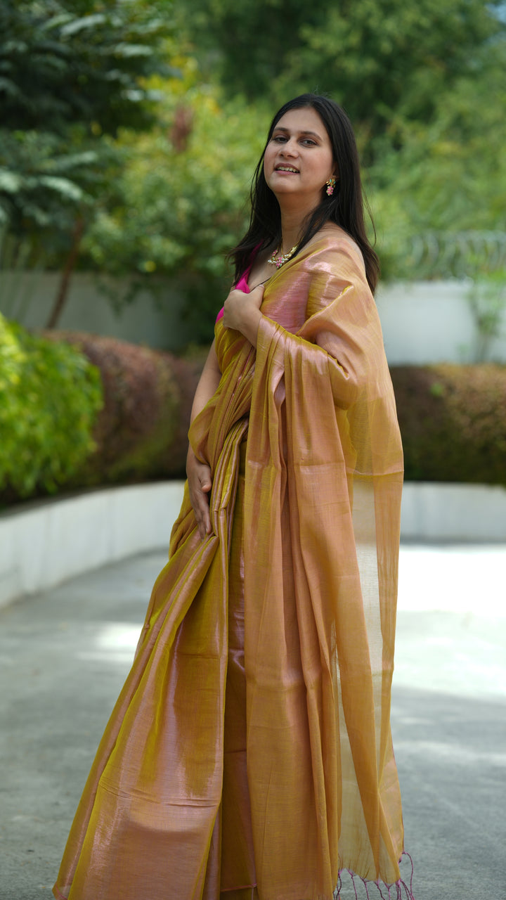 Draped in the Panna Gulabi Tissue Saree, the soft pink and green hues blending seamlessly. The delicate fabric shimmered with gold threads woven through, catching the light with every movement. The saree exuded an elegant charm, its fresh colors reflecting a graceful, timeless beauty, as it whispered of both serenity and sophistication in every step