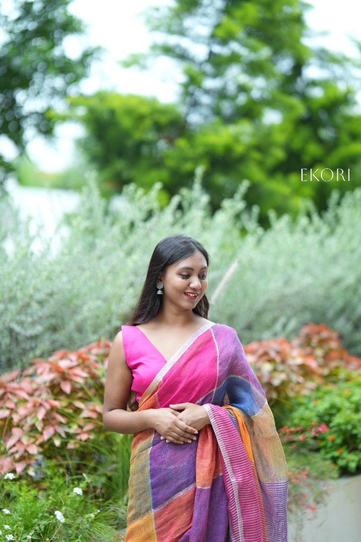 Shudh Sargam' collection—handloom linen sarees crafted from the finest threads. These sarees offer the best quality with a fresh, light feel, perfect for any occasion. Effortless to wear and exuding sophistication, they're your go-to for a stylish look. Linen, hailed as one of the finest fabrics, boasts unparalleled breathability, durability, and natural luster. Its ancient legacy includes royal wardrobes, showcasing its timeless elegance. Unlike other fabrics, linen becomes softer with each wash, maintaining its sophistication and strength. Its eco-friendly nature and refined texture make it a perennial symbol of luxury and comfort.