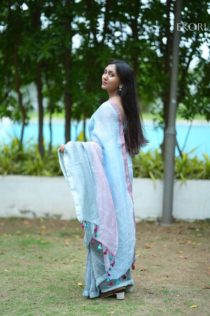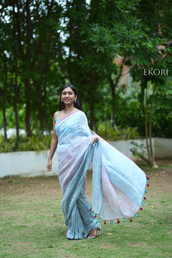 Shudh Sargam' collection—handloom linen sarees crafted from the finest threads. These sarees offer the best quality with a fresh, light feel, perfect for any occasion. Effortless to wear and exuding sophistication, they're your go-to for a stylish look. Linen, hailed as one of the finest fabrics, boasts unparalleled breathability, durability, and natural luster. Its ancient legacy includes royal wardrobes, showcasing its timeless elegance. Unlike other fabrics, linen becomes softer with each wash, maintaining its sophistication and strength. Its eco-friendly nature and refined texture make it a perennial symbol of luxury and comfort.