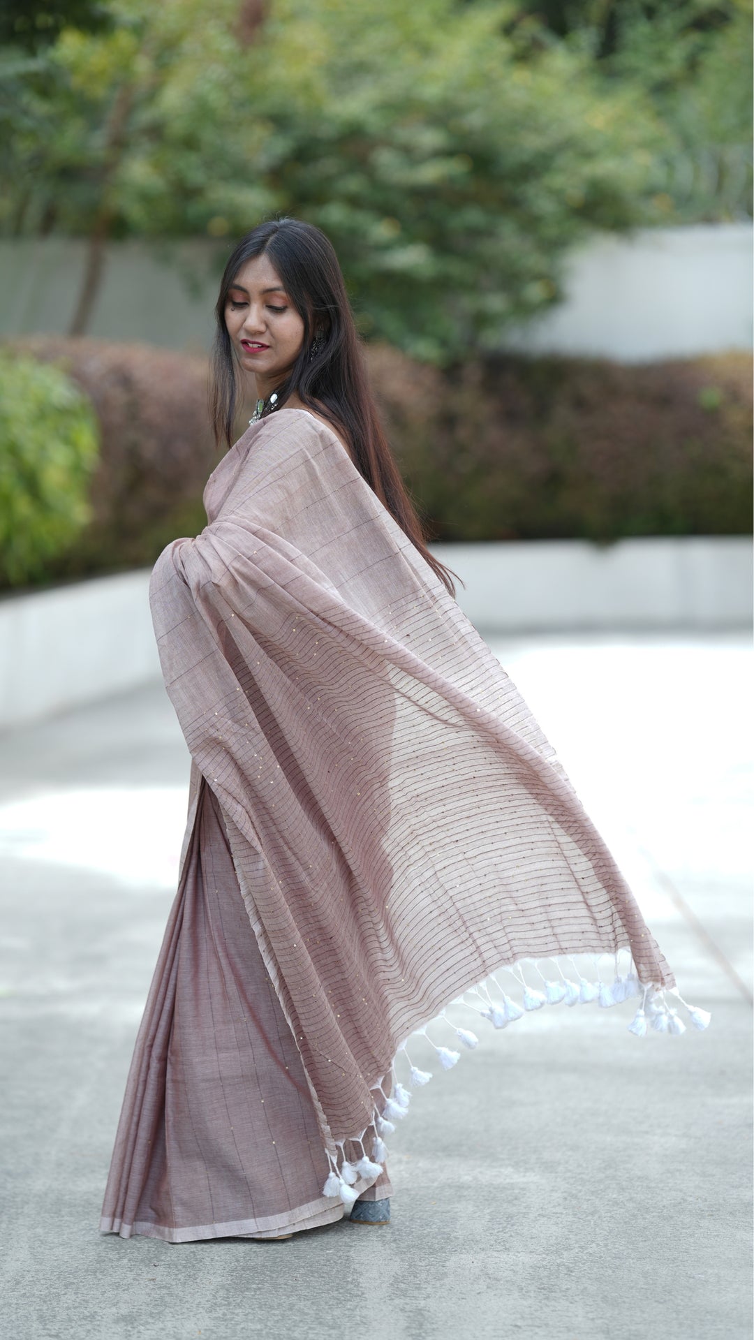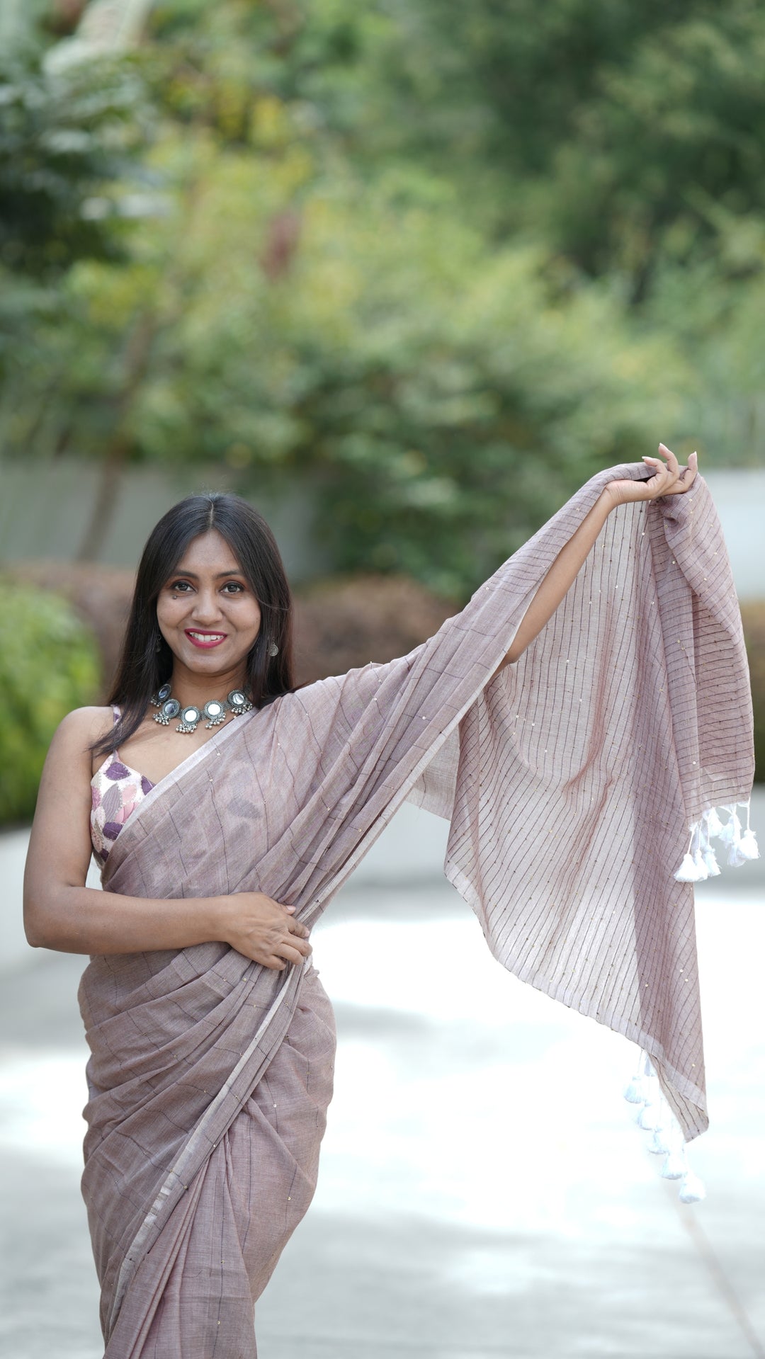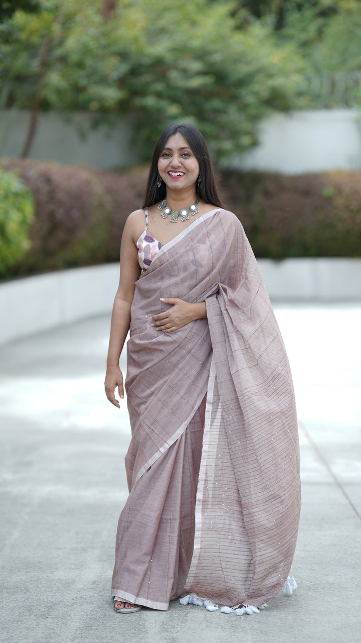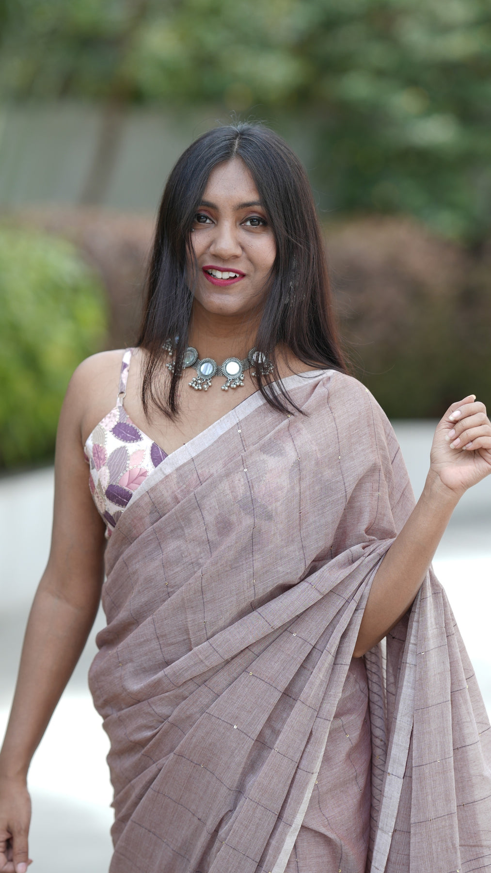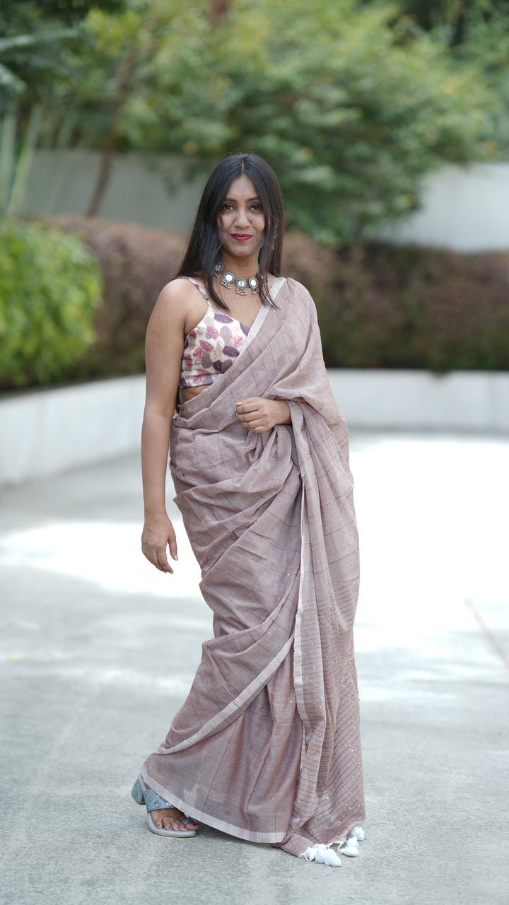 Draped in Mauve Gul, she looked like a dream kissed by the soft hues of dawn. The saree, in gentle shades of mauve with subtle floral motifs, radiated elegance and grace. Its smooth fabric hugged her figure, flowing effortlessly with each movement. The pallu, gently draped over her shoulder, added a touch of romance, while the delicate shimmer captured the light, reflecting her inner beauty and poise.