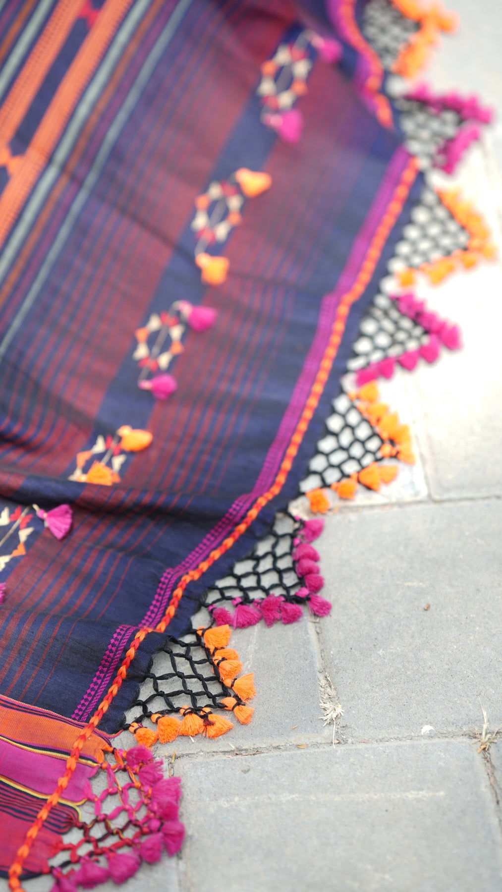 Blue Mecarised Cotton Saree with Stripes and Tassels