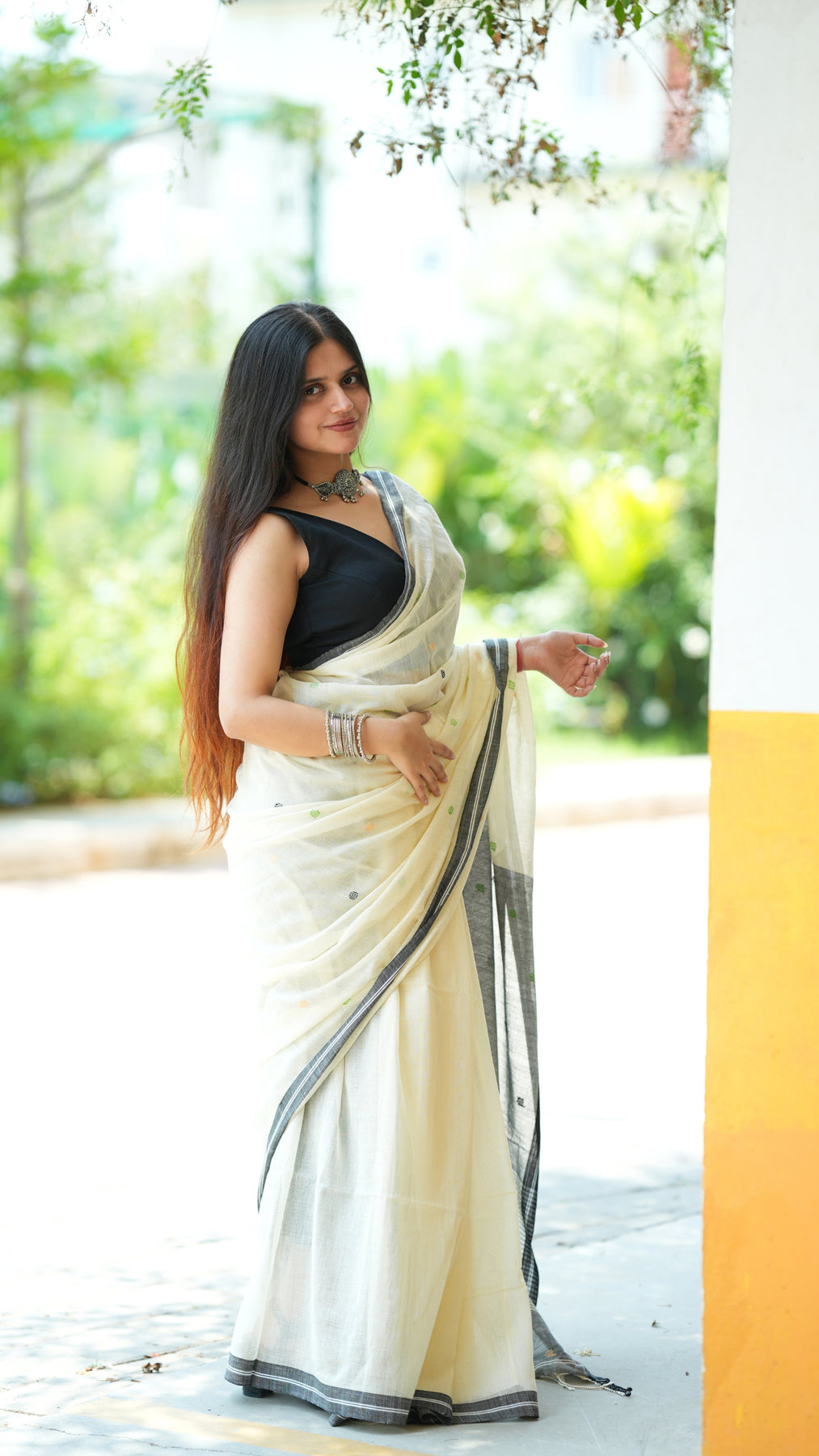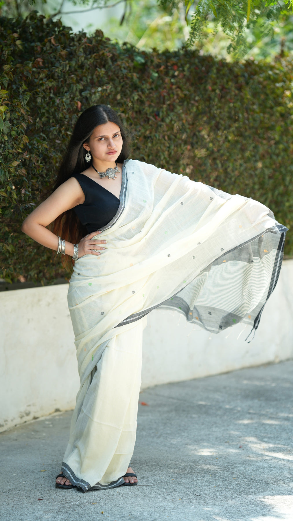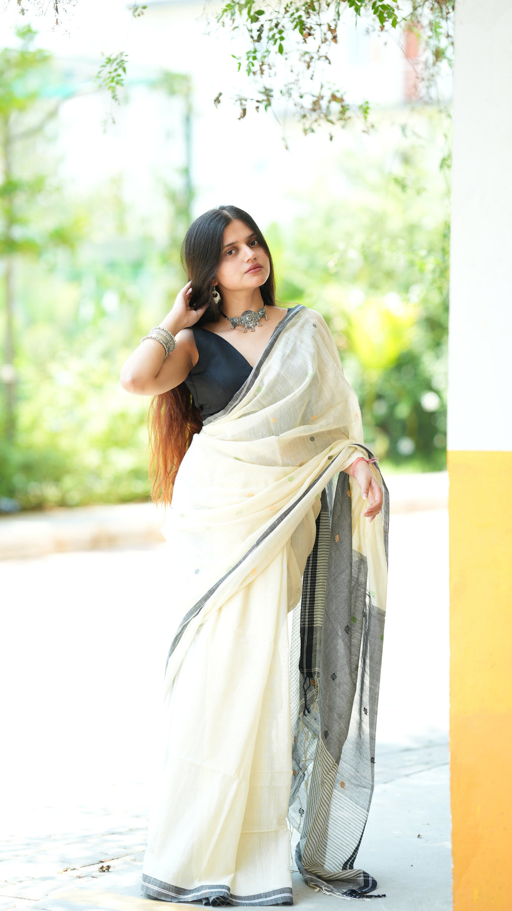 Each cotton by cotton Jamdhani saree is a canvas of dreams, where motifs float like poetry on a gossamer base. Woven directly onto the loom without the aid of printed patterns, every design is born from memory and intuition, passed down from master weaver to apprentice in a lineage of devotion. The all-cotton structure lends it a featherlight touch, making it breathable, natural, and perfect for the tropical warmth.