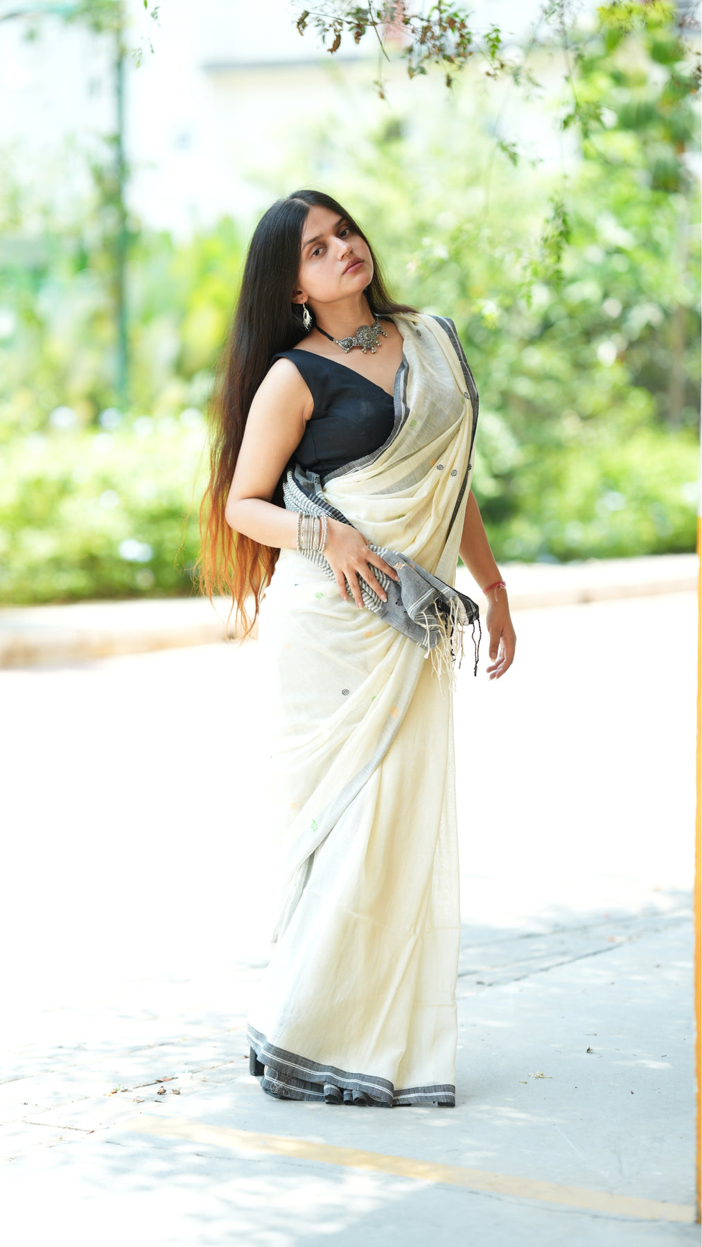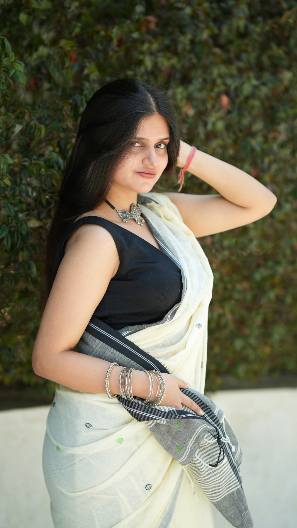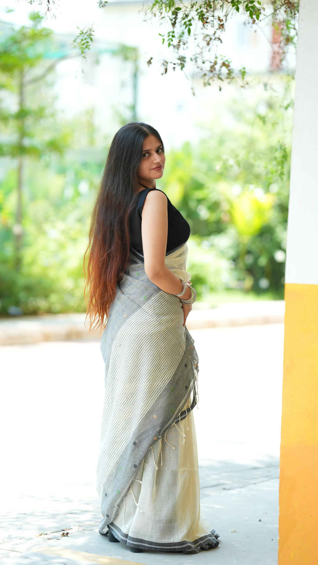 Each cotton by cotton Jamdhani saree is a canvas of dreams, where motifs float like poetry on a gossamer base. Woven directly onto the loom without the aid of printed patterns, every design is born from memory and intuition, passed down from master weaver to apprentice in a lineage of devotion. The all-cotton structure lends it a featherlight touch, making it breathable, natural, and perfect for the tropical warmth.