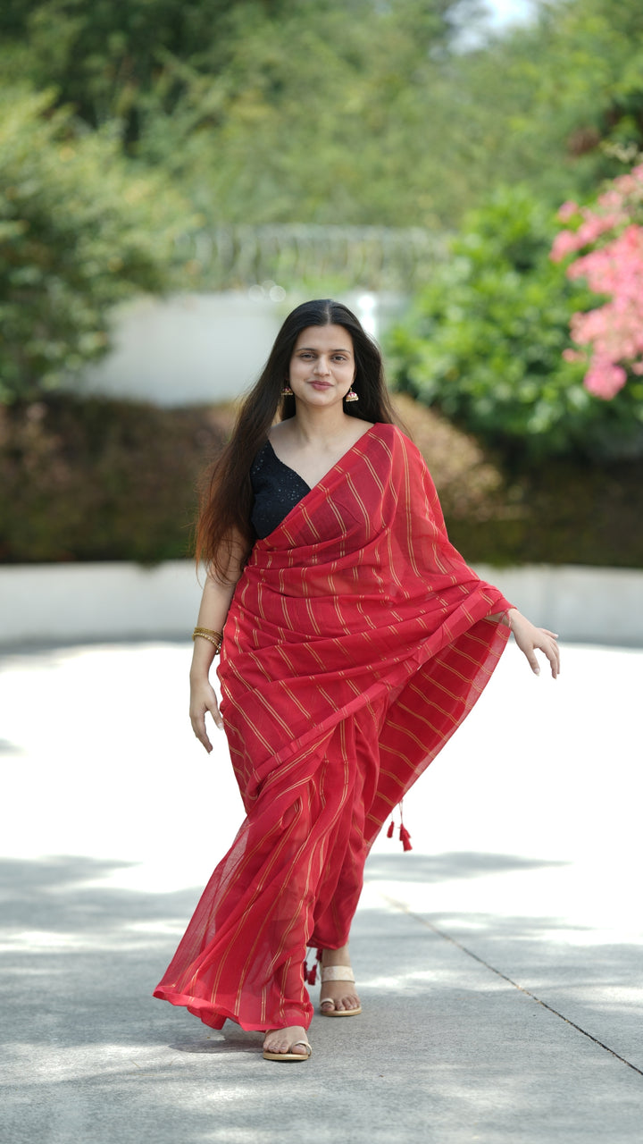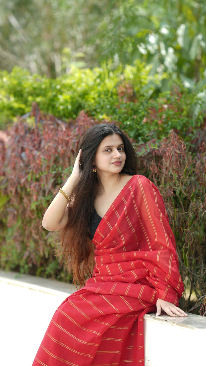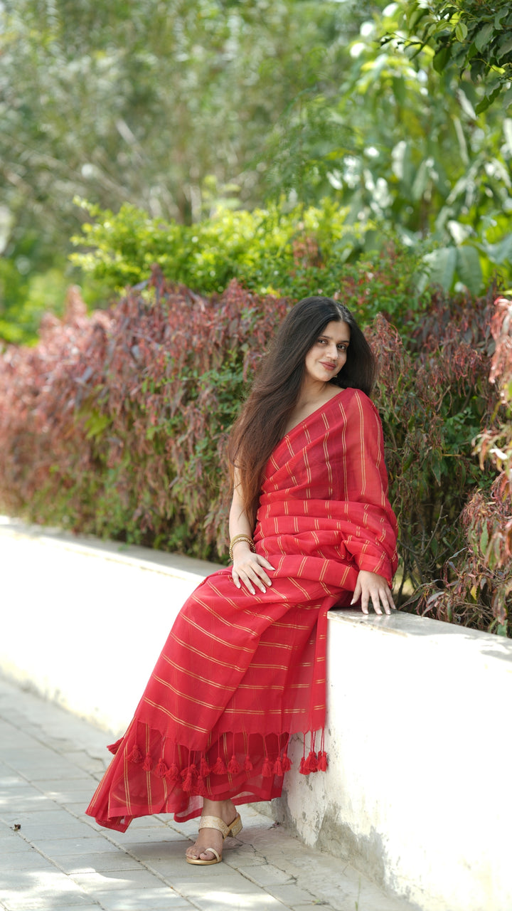 Red Soft Mulmul Cotton Saree with Zari Stripes and Tassels