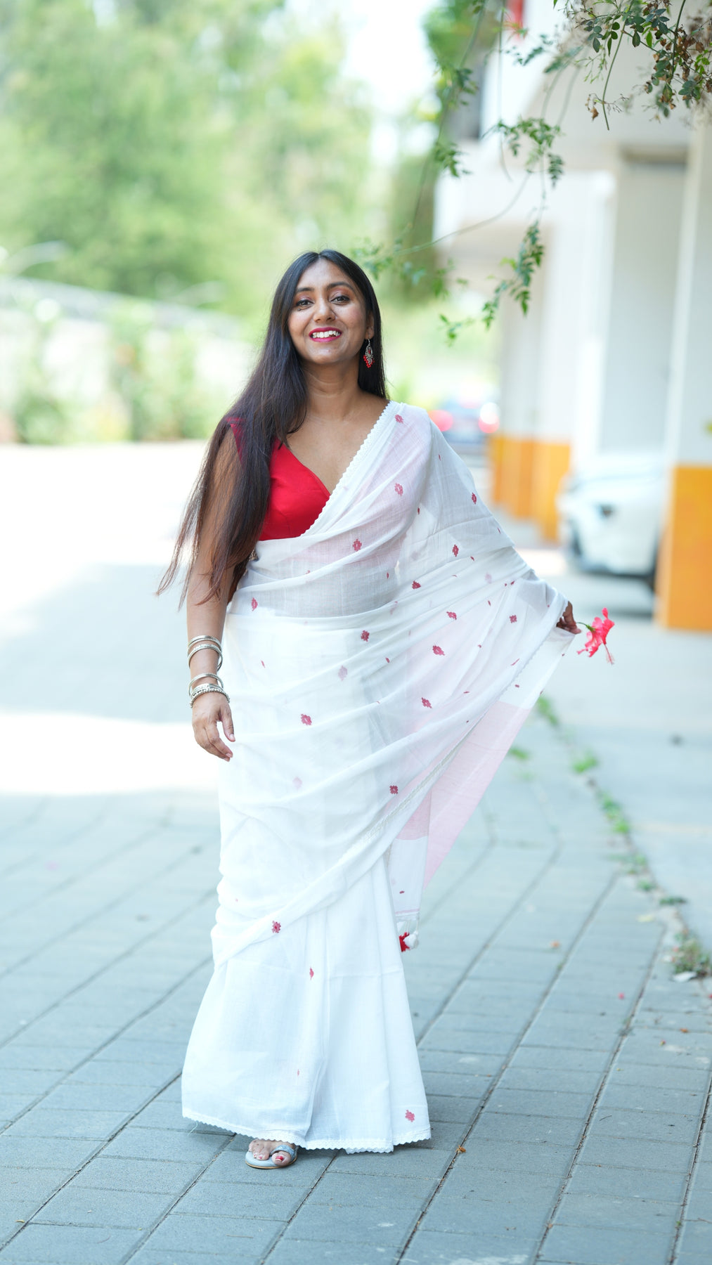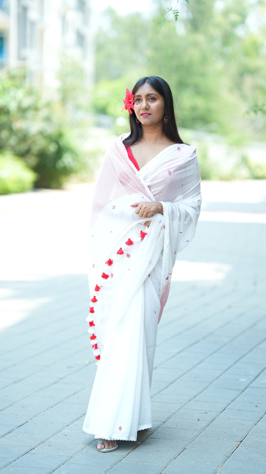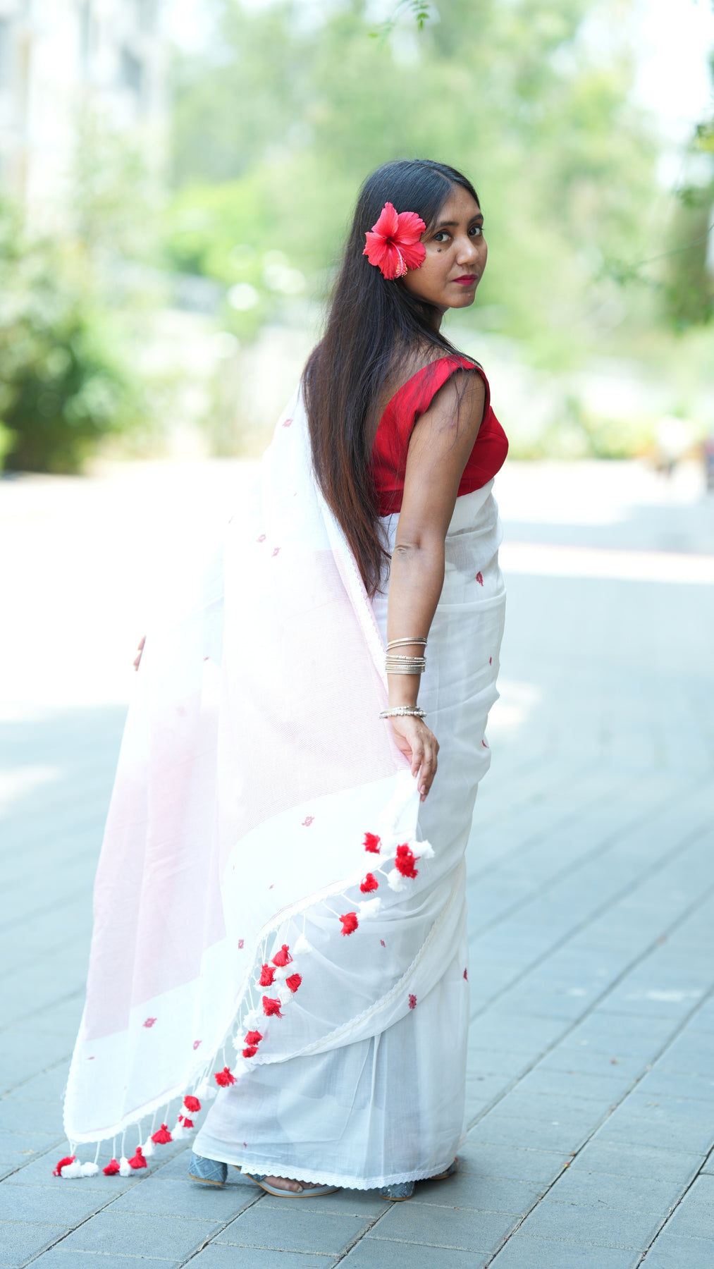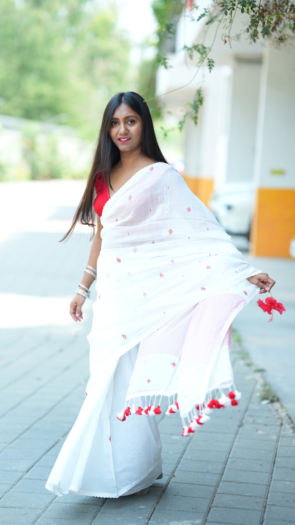 White cotton Jamdhani saree, sprinkled with rose-hued floral butis and red-white tassels
